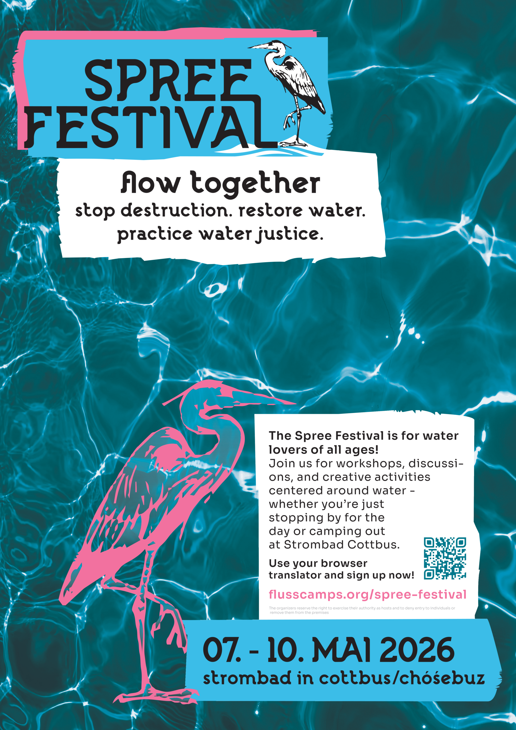 Das Spree Festival ist ein Ort für Austausch, Wissen und kreativer Aktion für alle Wasser-Fans. Egal ob Wassersport, Angelverein oder Wasserratte: Wir laden alle ein, die sich mit Wasser, Seen oder Flüssen identifizieren und sich gemeinsam für Wassergerechtigkeit einsetzen möchten.